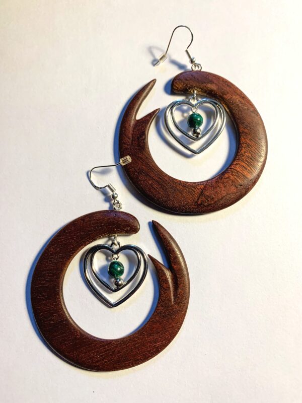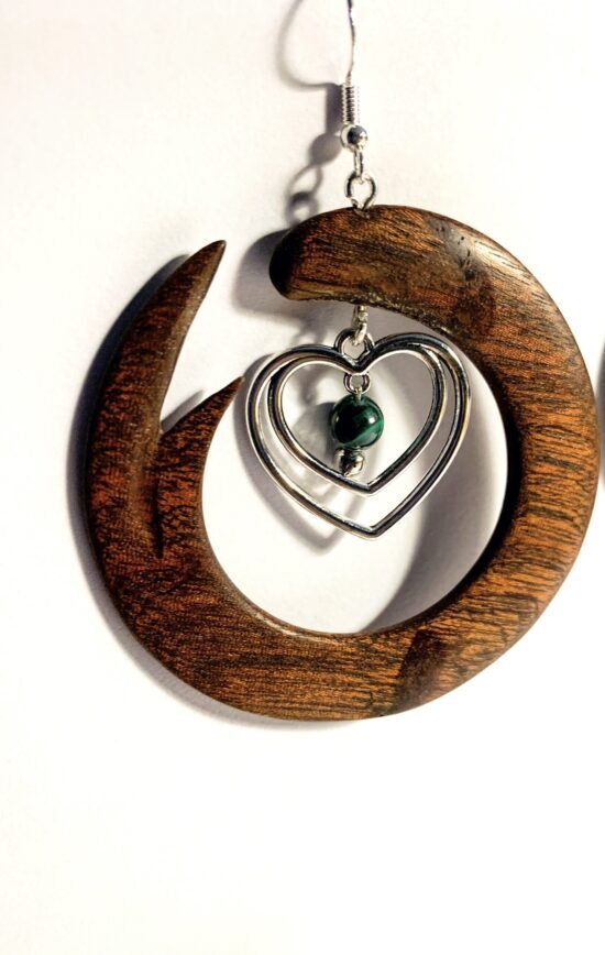 Boucles d’oreilles en bois exotique avec cœur argenté suspendu et perle centrale de malachite.