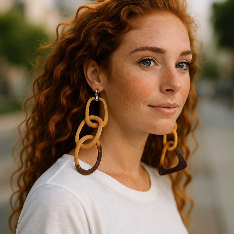 ‍Deux chaînes en coque de  noix de coco et aux formes géométriques, sont suspendues à des crochets argentés pour dessiner ces boucles d’oreilles bicolores.