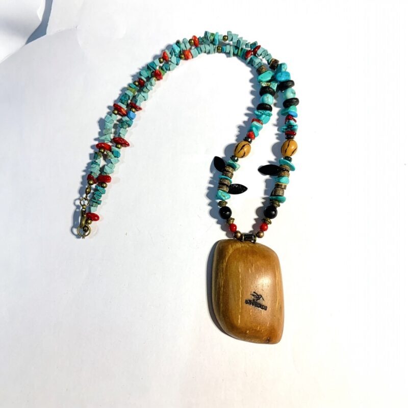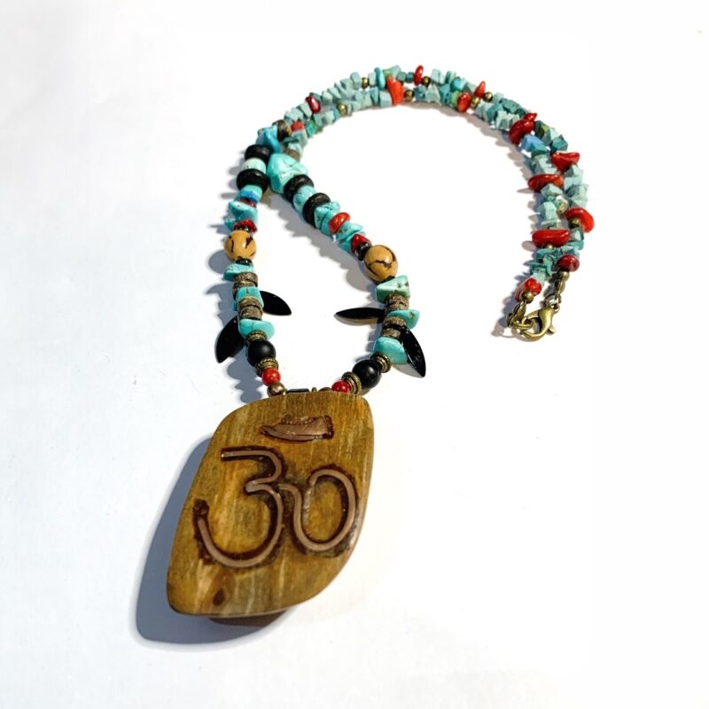 Ce collier associe force symbolique et finesse artisanale. Son pendentif central, taillé dans du buis —bois noble réputé pour sa densité et sa douceur au toucher— est orné du symbole « Om » en cuivre cintré et incrusté. L’enfilage mêle éclats de turquoise, corail rouge, onyx, hématite, graines de palmier et perles de coco. La finition est assurée par un fermoir mousqueton et apprêts en laiton vieilli.