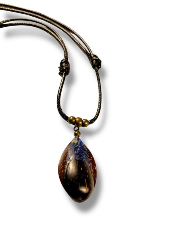 Ce collier est monté sur un cordon réglable en polyester noir dont un pendentif ovoïde qui associe la graine de palmier Dindé et une ellipse de noix de coco, soudées entre elles. Une inclusion de lapis-lazuli, intégrée dans la matière, apporte une profondeur bleutée qui contraste avec les tons bruns et naturels du bois et de la graine.