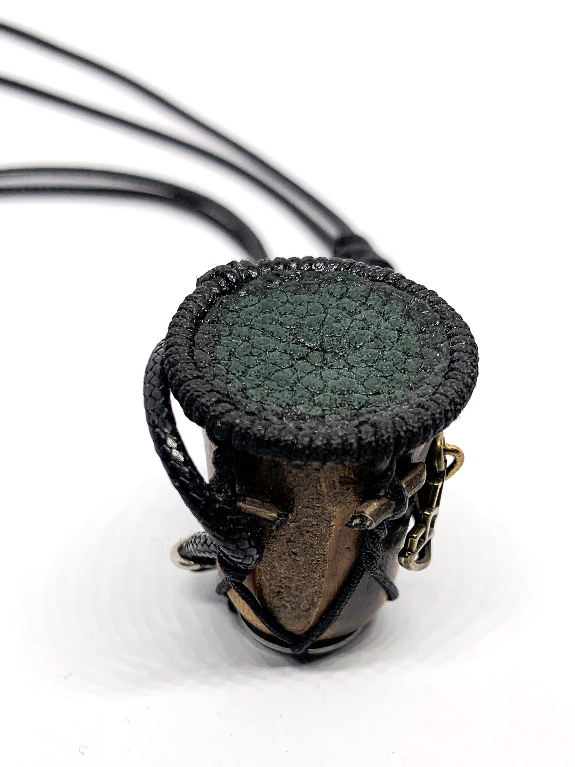 Monté sur un cordon réglable en polyester, ce pendentif tambour est taillé dans du bois de bambou. Le cordage, fidèlement reproduit, habille l’instrument jusqu’au cerclage entourant le cuir. En son flanc, un symbole doré de fleur de Lotus vient évoquer la spiritualité enracinée dans la percussion.