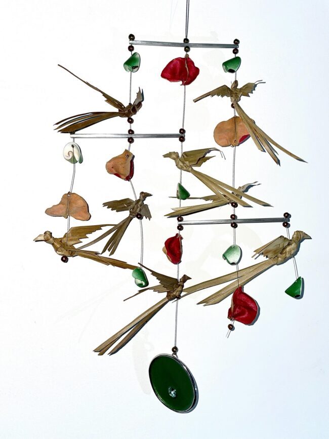 Mobile décoratif composé d’oiseaux minutieusement tressés à la main à partir de feuilles de cocotier séchées et façonnées.