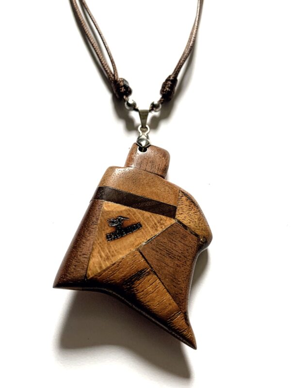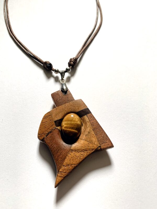 Ce pendentif géométrique est une pièce exceptionnelle façonnée à la main à partir d’essences de bois précieux harmonieusement assemblées: Noyer, Érable, Acajou et Wengé dessinent un motif anguleux et fluide à la fois. En son centre, une pierre d’œil-de-tigre capte la lumière, apportant son éclat doré au cœur des tons bruns et chauds du bois. Le montage est réalisé sur un cordon en polyester. Chaque facette à été poncée et cirée avec soin pour révéler la profondeur naturelle des fibres.