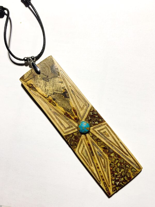 Ce pendentif unique est façonné en bois d’olivier, dont le veinage doré est rehaussé par une pièce contrastante en bois de charme. Les lignes géométriques sont soulignées par l’incrustation délicate de fins fils de cuivre, dessinant une symétrie moderne. Des graines de Roucou, naturellement rougeoyantes, apportent une texture organique captivante à l’ensemble. En son centre, un cabochon de Turquoise cuivrée vient illuminer la composition, comme un œil minéral au cœur du bois. Le tout suspendu à un cordon réglable en polyester noir.