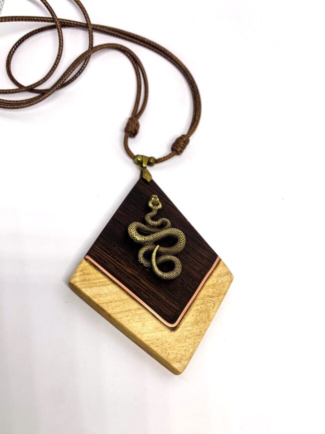 Ce pendentif associe deux matières nobles dont l’ébène et le buis séparés par un fil de cuivre. L’ornement central représente en serpent en laiton et le cordon, réglable, est en polyester.